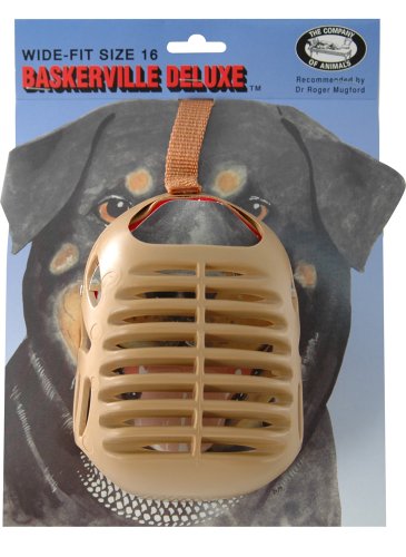 Baskerville Muzzle's are designed for the dog who's not perfect all the time. Humane, comfortable, safe. Permits panting and drinking. Made from soft plastic mesh. The lightweight, basket design of the Baskerville muzzle gives all round protection but still allows unrestricted panting and drinking. Your dog feels comfortable and you have the security of being able to decide what should go in his mouth! It is lightweight and washable. The range is made from soft, plastic mesh which is also washable. Estimated Size Guide: Size 1 & 2: Miniature. Size 3: Bichon Frise. Size 4: Westie. Size 5: Corgi. Size 6: Beagle. Size 7: Springer. Size 8: Labrador. Size 9: GSD. Size 10: Great Dane. Estimated Wide Fit Size Guide: Size 12: Boxer / Pitbull. Size 13: Mastiff. Size 15 Deluxe: Rottweiler. Size 16 Deluxe: Bull Mastiff. Please use the selector box below to choose the size you require.